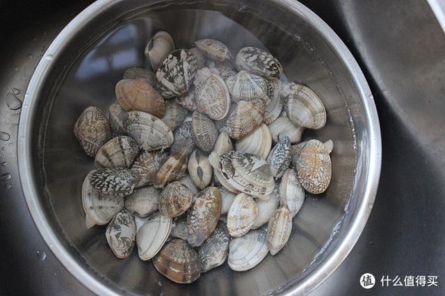 买来的花蛤放入盆中加一勺盐吐沙备用