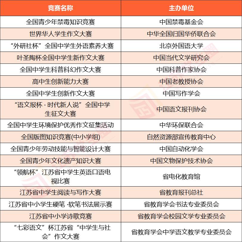 江苏省中小学“金钥匙”科技竞赛、江苏省青少年科技模型大赛、江苏省青少年科技创新大赛、江苏省珠心算能力比赛、“领航杯”江苏省中小学生信息素养提升实践、“领航杯”江苏省青少年网络信息安全应用能力竞赛、江苏省中小学生实验能力大赛、“领航杯”江苏省中学生英语口语电视比赛、江苏省中学生阅读与写作大赛、江苏省中小学生硬笔·软笔书法展示赛、江苏省中小学诗歌竞赛、“七彩语文”杯江苏省“中学生与社会”作文大赛