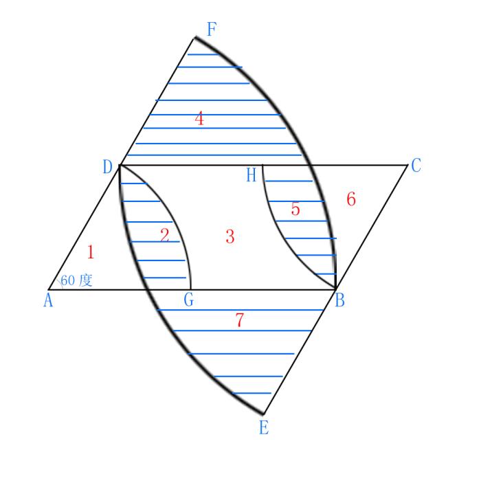 已知平行四边形的一个角是60度,分别以A为圆心,为AB半径画弧,交AD延长线于F;以A为圆心,AD为半径画弧,交AB于G。另外一半对称画出。求图中阴影部分面积。