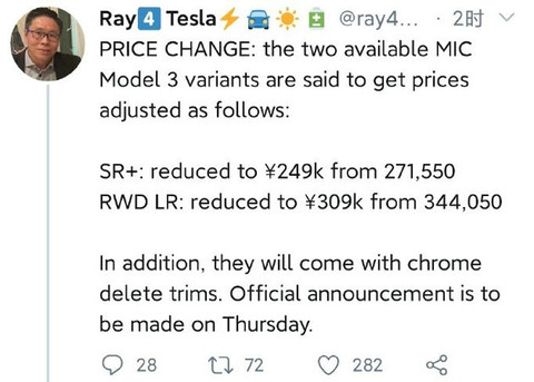 易车讯近日,在社交平台上有国产特斯拉Model 3或将开启新一轮价格调整的传言,虽然目前还不能确定消息是否准确,但是考虑到目前国产特斯拉Model 3的制造成本还在进一步降低,因此从长周期来说,降价的可能性是存在的。