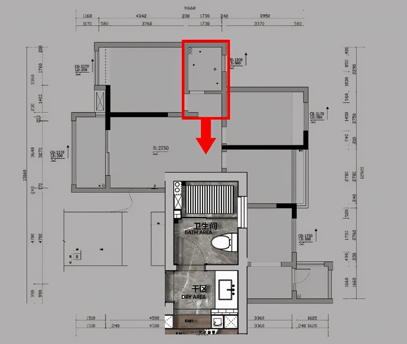 当外部空间允许的时候,我们就可以选择将台盆外移,给卫生间内部空间腾出位置,实现干湿分离。